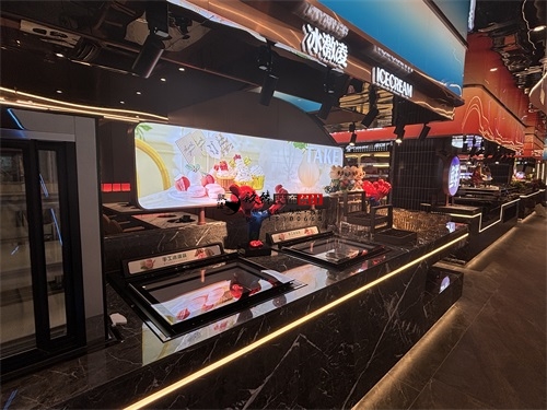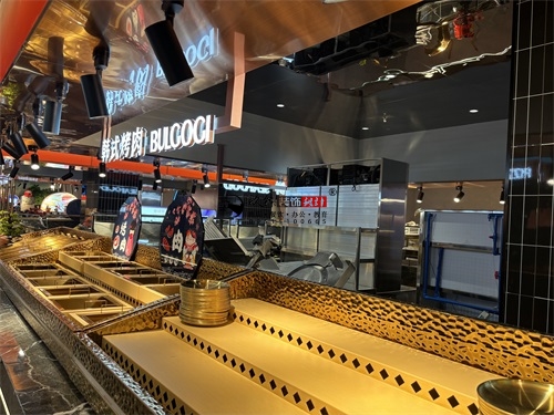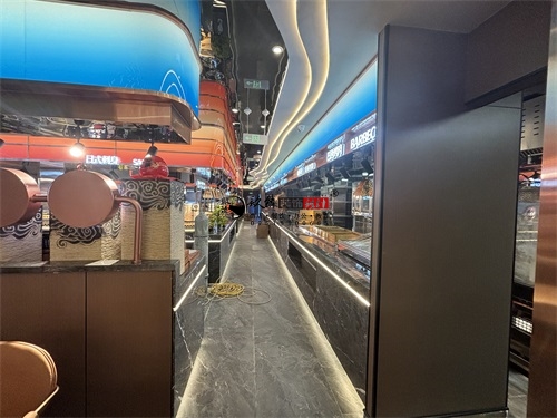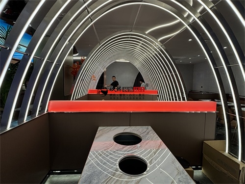 今天分享的是中卫回香渔自助餐厅装修设计实景照片,整体而言,这家自助餐厅装修设计上精准踩中了“年轻时尚+功能实用”的餐饮装修趋势:用流动曲线、霓虹光影打造网红属性,用材质平衡、分区布局满足自助餐饮的实际需求,既适合朋友聚会的休闲场景,也能通过空间质感提升品牌调性。材质搭配上,自助餐厅采用“冷硬工业风+柔和轻奢感”的平衡策略:地面与餐台基座选用深色大理石与金属质感的饰面板,强化了空间的感与耐磨实用性;而卡座沙发、餐椅则采用暖橙色的软包材质,中和了石材与金属的冷硬,同时通过金属细框的椅架设计,保留了轻奢调性。